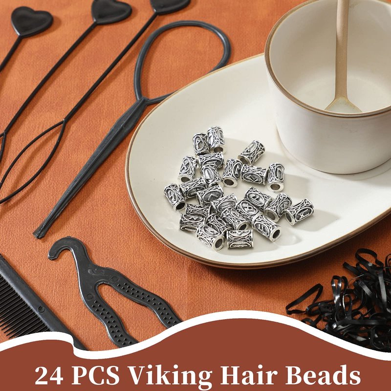 24 Piece Norse Vikings Runes Hair Beard Beads for Bracelets Necklace Accessories DIY Includes 7 Pieces Pull Hair Pin Quick Beader Hair Tool and Black Rubber Bands for Women Men