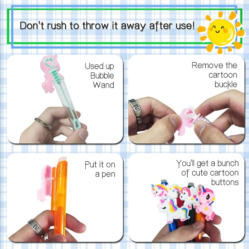 - Bright Color,Multiple Full Unicorn Elements Design - 6 different colors of bubble wand,The patterns on the straw can come off,They are very humorous.