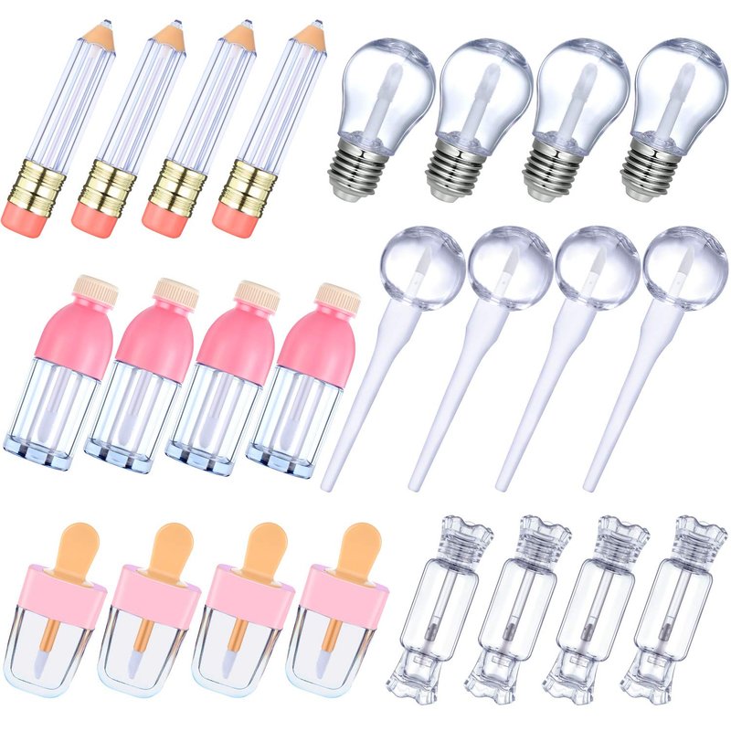 24 Pieces novelty empty lip gloss tubes, ice cream and funny light bulb shaped lip balm tube, creative lollipop shape, bottle and candy shaped lip glaze tube, pencil lip oil bottles, 6 stylesFeatures: Clear body design: Transparent body of these funny lip balm bottles allows you to see the remaining volume of cosmetics in container clearly and the lip gloss color conveniently, add more colors and vitality to your life. Practical tool: Our lip glaze tube with brush can help you apply lip gloss evenly, makes your lip more beautiful and charming, good to refill your lip gloss, lip glaze, lip oil and eyelashes growth oil, nice for DIY. Specifications: Material: plastic Size: as pictures show Color: as pictures show Quantity: 24 pieces Package includes: 4 x Ice cream shaped lip gloss tubes4 x Funny light bulb shaped lips balm tube4 x Creative lollipop shape lip gloss tube4 x Adorable bottle lip balm bottle4 x Candy shape plastic lip balm containers 4 x Pencil lip oil bottles