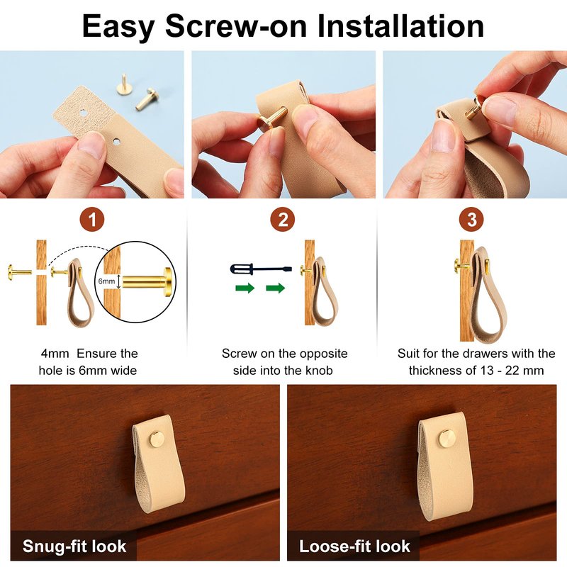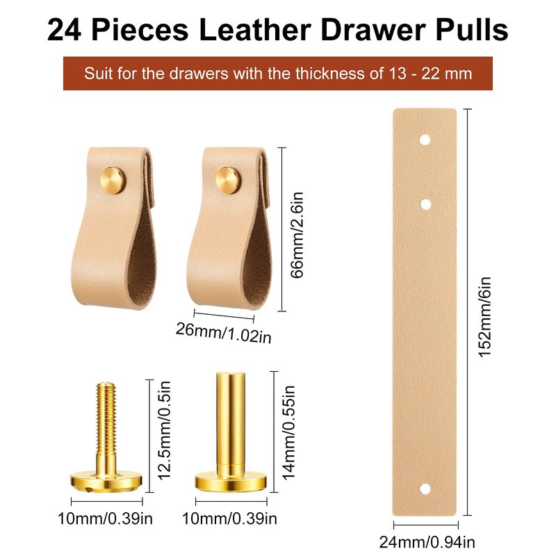 - Quantity and size details: you will receive 24 pieces of PVC leather pulls in light brown, and there are also 24 pairs of brass screws; These PVC leather knobs pulls are well suitable for the drawers with the thickness of 13 - 22 mm, and they are fit for 5 - 9 mm thick drawers as well