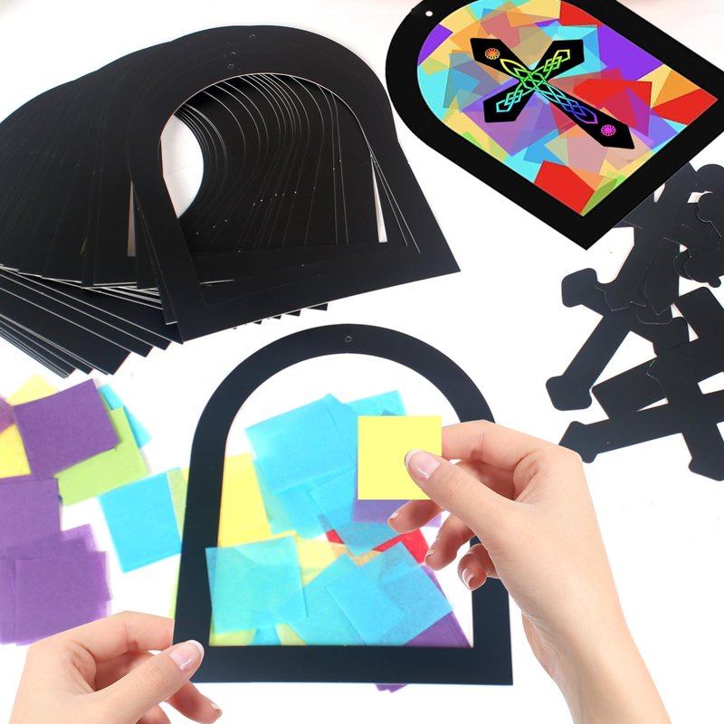 24 Sets Religious Cross Crafts, Scratch Religious DIY Crafts Kit with Rainbow Color Tissue Paper Craft Kit DIY Christian Crafts Resurrection Church Craft Ornaments Jesus Sunday School Craft for Kids