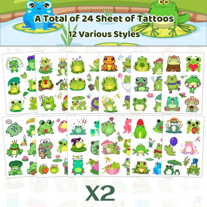 One tattoos pack contains 24 sheet frog temporary tattoos with 12 various styles. Each of our frog tattoo stickers has a unique design to make your life brighter.