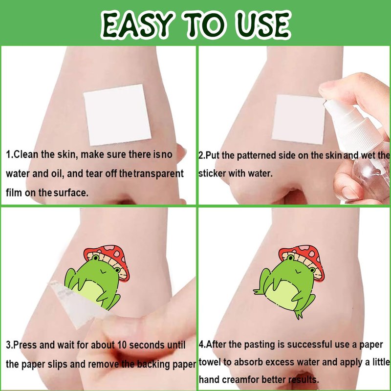 - 【How to Use】Cut each frog tattoo out of sheets and remove the sheet clearly. You can stick it on hands, face, arms or wherever you feel safe. Moreover, you put it down on glasses, clothes, and a smooth flat. After that, you wet it thoroughly with water and wait for 20-30 seconds, you get rid of the backing paper.