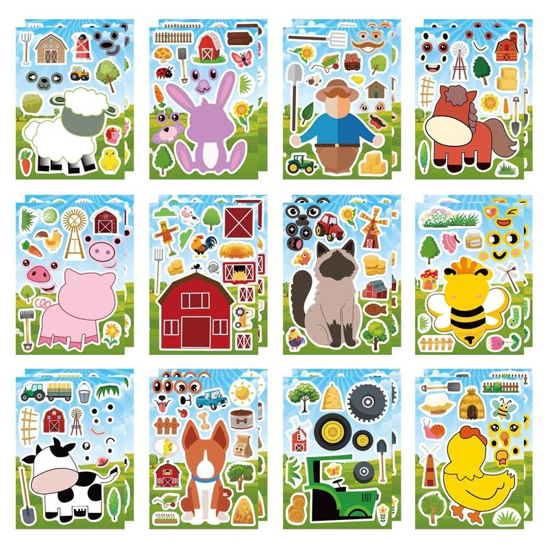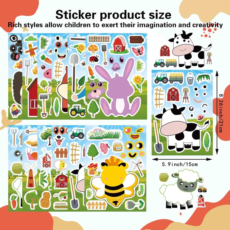 - Super Value Pack: You will receive 24 sheets Make Your Own Farm Animals Stickers in 12 different styles, like cow, pig, horse, sheep, chicken, etc.8.26''×5.9'' per sheet. Great size makes it easier for kids to operate.