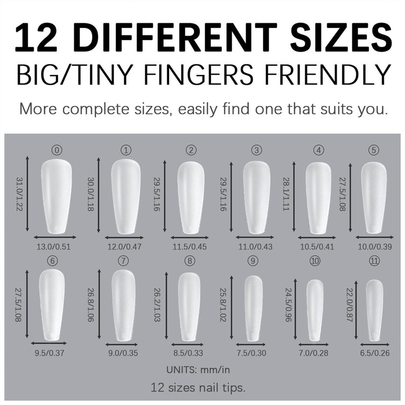 - 【Package & DIY Nails】You'll get 240 false nails tips in 12 sizes. 1 mini nail file, 1 small wooden stick, 1 piece of adhesive tab glue. You can safely choose a fake nail that fits your finger size and DIY your desired nail pattern.