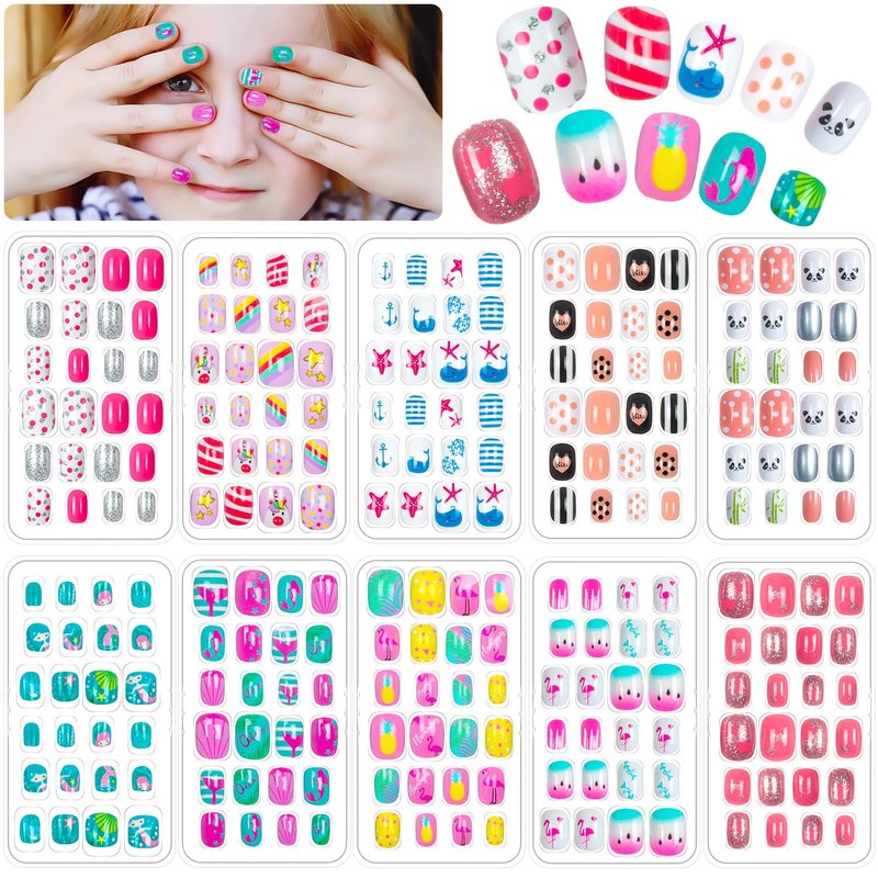 - VALUE FAKE NAILIS FOR KIDS - These funny press on nails for kids comes with 10 boxes of girls fake nails, each box has 24 pieces nail tips,240 pieces in total. Create novel and eye-catching nail art styles with different sizes and bright colors