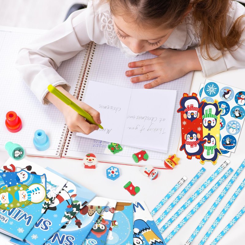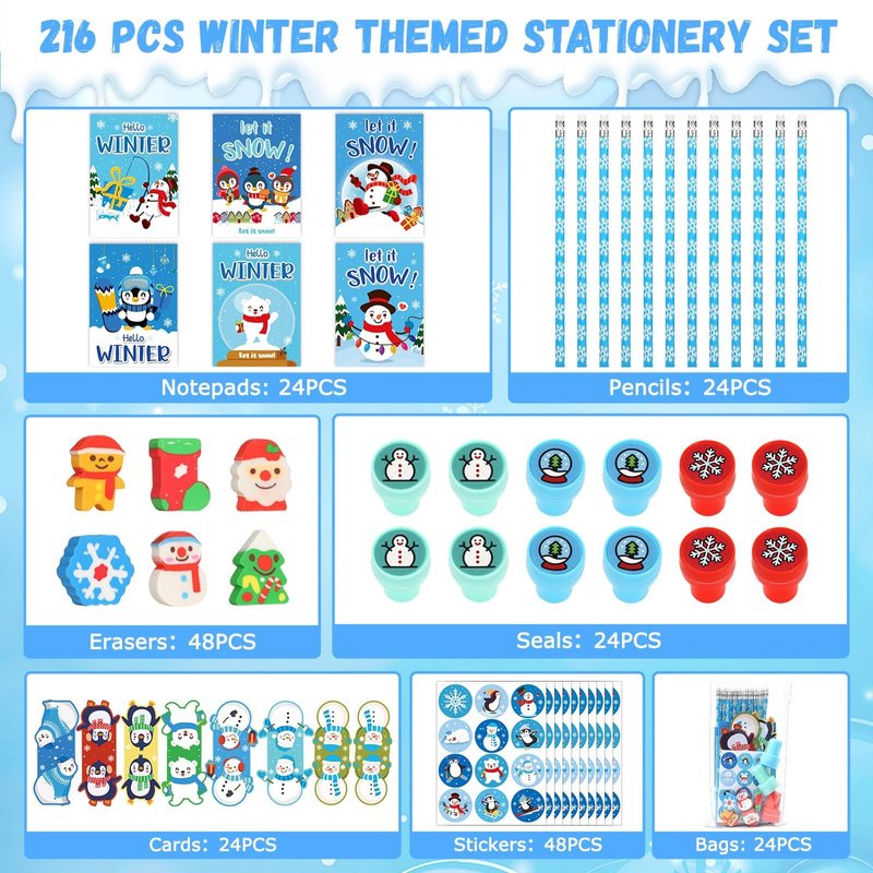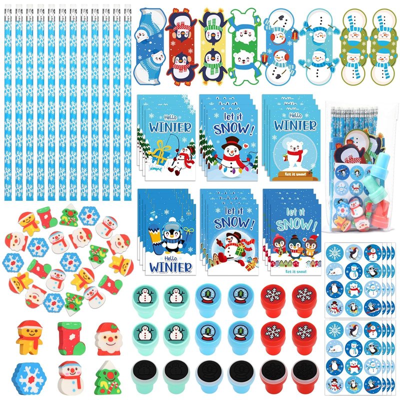 240PCS Winter Stationery Set for Kids Christmas Stationery Party Favors Snowflake Stationery Kit Snowman School Supplies Classroom Gifts Exchange Include Pencils Erasers Stickers Stamps Notebooks