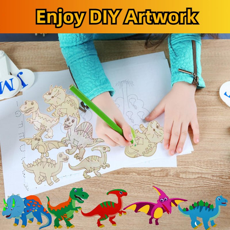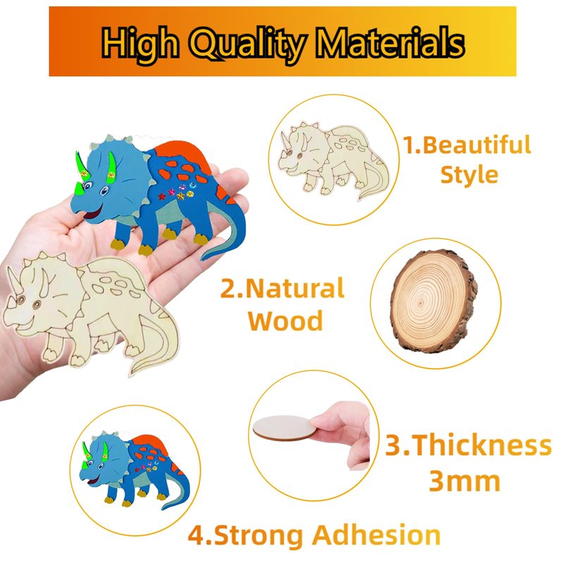 - Quality Materials: The Wooden Painting Crafts for Kids are made of high quality natural wood, sturdy and durable, no odor, both sides of the wooden dino ornaments have been polished, the surface is very smooth, no burrs, won't hurt the children's hands, and very easy to paint and color, the rhinestones are sticky and easy to paste, the dinosaur painting kit is a best DIY crafts set for children, please rest assured to buy.