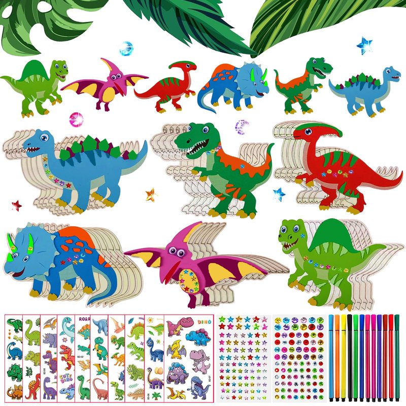 - DIY Wooden Dinosaur Set: You will receive 246pcs DIY Wooden Dinosaur adornment, including 30 Unfinished Wooden Dinosaurs (6 Styles) + 202 Rhinestones (2 Styles) + 12 Colored Pens (12 Colors) + 2 Tattoo Stickers (2 Styles), enough number of wooden dinosaurs and rhinestones to satisfy children's handmade creation needs.