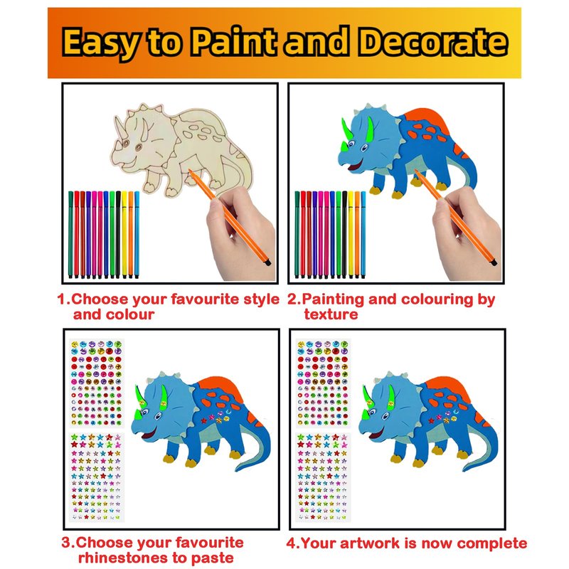 - DIY Innovative Crafts: Our Dinosaur Crafts contains 12 colors of pens and rhinestone adornment, small children can choose their favorite color pens and rhinestones for painting creations, each wooden dinosaur has countless possibilities of finished dinosaur wood craft, different colors and adornment with will give children different surprises, so that children in the process of making the moments are kept fresh and make the Children feel pleasure.