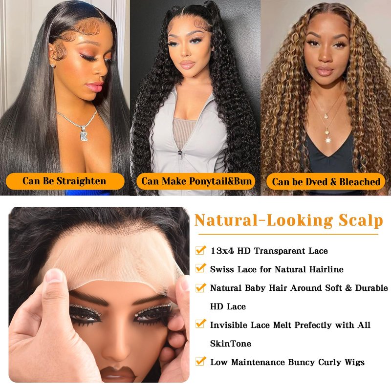 - 【Curly Lace Front Wig Human Hair Materia】100% Unprocessed 10A Brazilian Virgin Human Hair Curly Lace Frontal Wigs, Full and Thick, Natural Look, Health and Comfort, Soft and Bouncy, Can Be Dyed, Bleached, Straightened and Restyled.