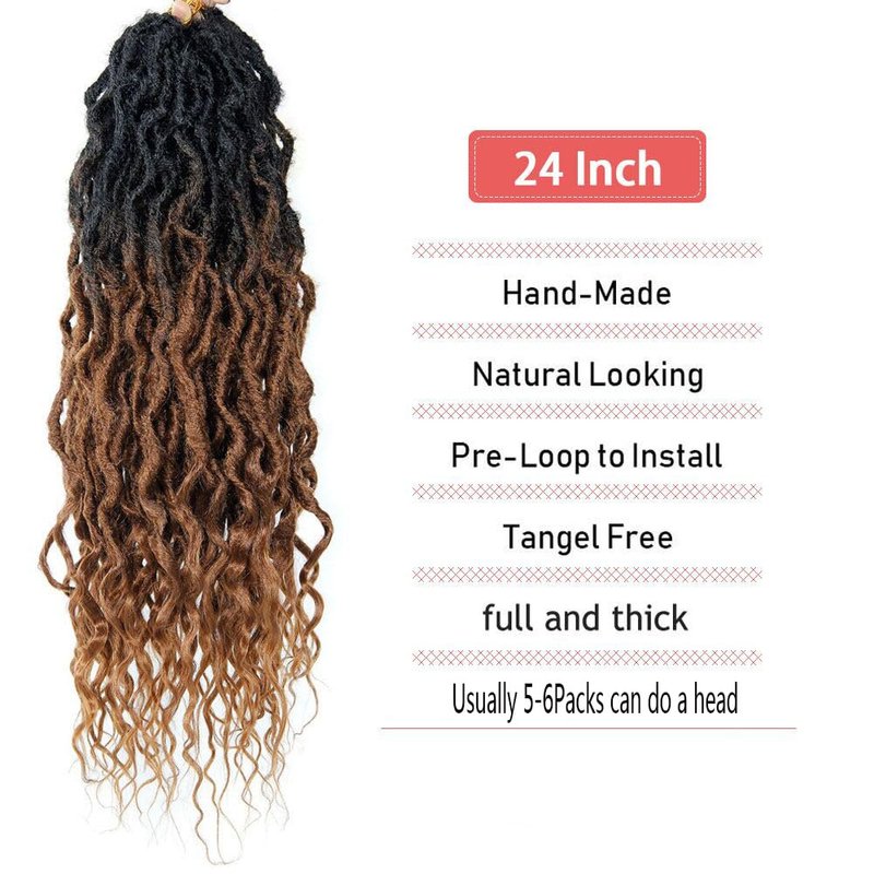 Hair Information: Material:100% Synthetic Hair Item Type: Goddess locs Crochet Hair Color: Color:1B#,1B/27#,1B/30#,#1B/BUG#,51#, Faux Locs Braid Hair Hair Length: 24 inches Weight: 90g±5g/pack Items Per Package: 12 Roots/Per Pack, 6Packs/Lot. Goddess locs Crochet Hair Great Quality: Lightweight, Not Rough, No Smell, Smooth, Tight, Shiny and Silky, Compact, Very Soft, Not Easy To Separate. Beautiful Hair And Look Natural, Easy To Install. Fashion Styles: Beautiful and Fashion, New Style, Really Cute, Beautiful Curls ends, Feeling Like Goddess, Looking Like a Queen.