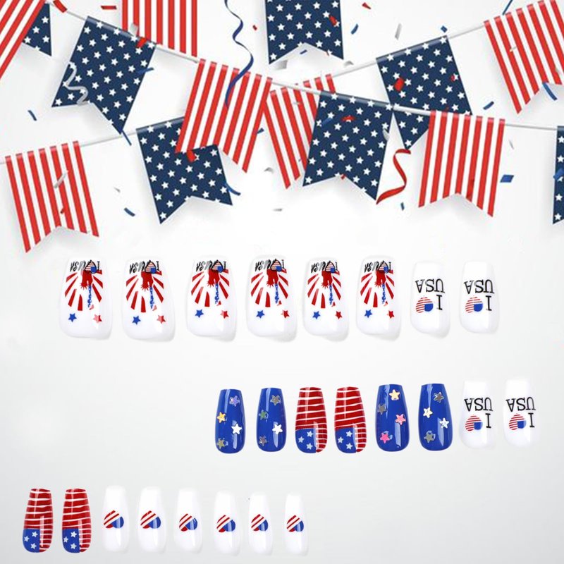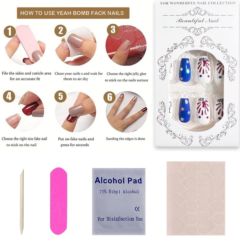 - Packaging includes:You will receive 24pcs Independence day fake nails, 24 jelly glue, 1 small wooden stick, alcohol bag, nail file, no additional tools required.