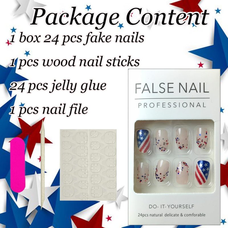 - 【Independence Day Nails Set Package Contents】24 Pcs Patriotic Short Press on Nails +1 Nail File + 24 Pcs Jelly Glue Stickers+1 Wooden Stick.(Durability of jelly glue is not as good as liquid glue, but it makes independence day fake nails reusable. Please use suitable glue according to different scenes)
