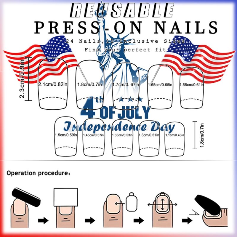 - High-Quality Material - Shine Fourth of July artificial fingernails is made of high-quality ABS environmental friendly acrylic material. It is odorless, not easy to fade. reusable artificial nails provides you with a comfortable and wonderful experience.