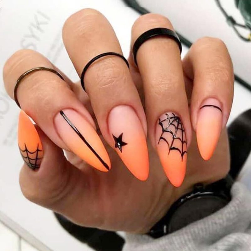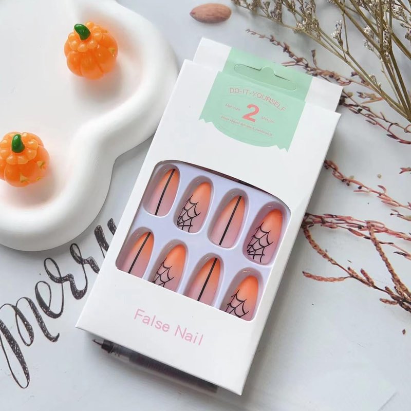 24Pcs Almond Halloween Press on Nails Medium Fake Nails Glossy Orange Halloween Acrylic Nails Full Cover Spider Web Glue on Halloween Nails Medium Stick on Nails for Women Halloween Day Manicure