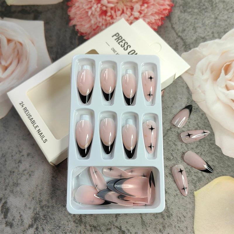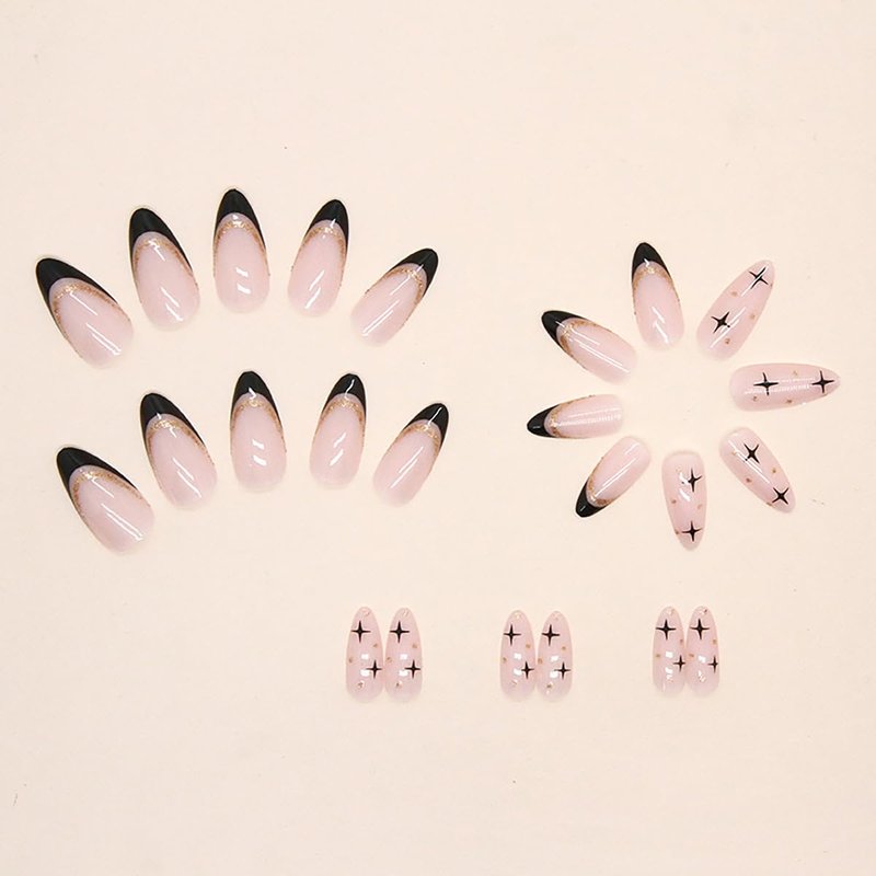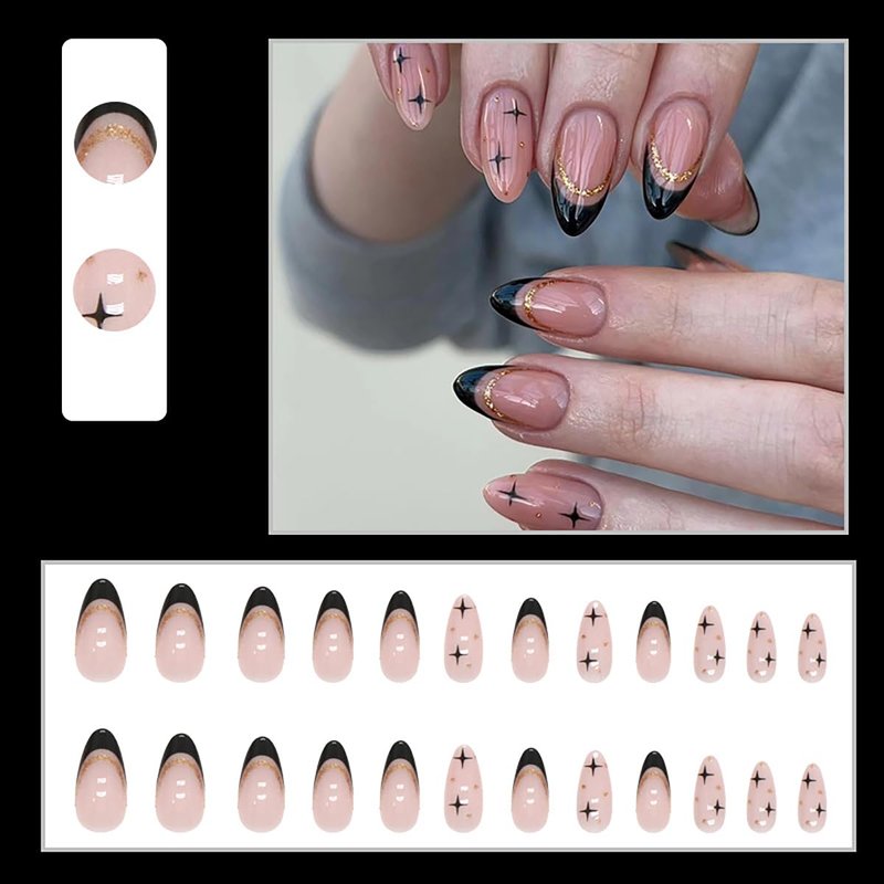 24Pcs Black French Tip Press on Nails Almond Pointed Fake Nails Gold Glitter Line Design Acrylic Glue on Nails Star Short Fake Nails Glossy Full Cover False Nails for Women Girls Manicure Supplies