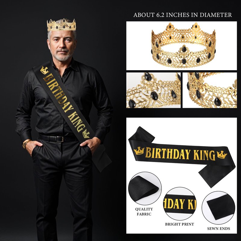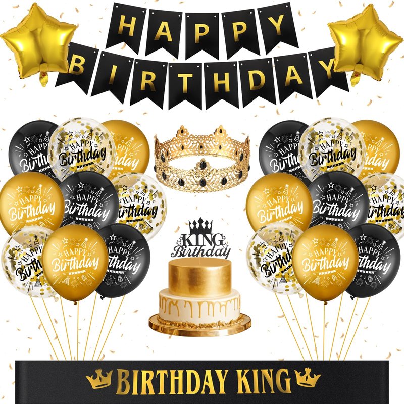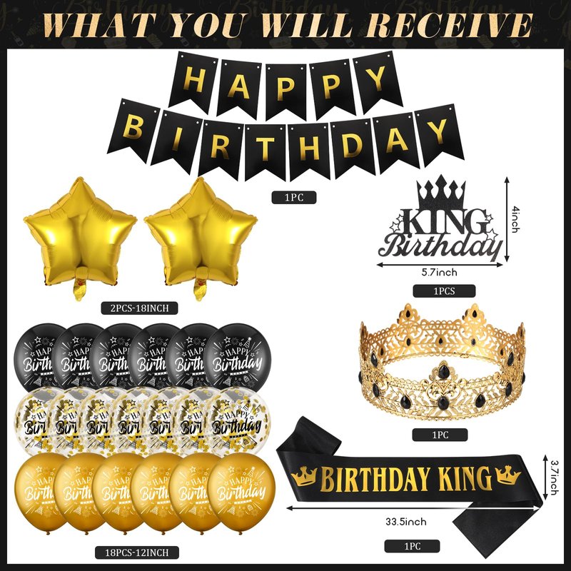 - What you will receive: our products include 1pc happy birthday banner, 1pc birthday crown, 2pcs 18" star foil balloons, 18pcs 12'' happy birthday balloons, 1pc 5.9" x 3.9 "birthday king cake topper, 1pc 33.5" x 3.7 "birthday king sash, enough for you to use at you or your father birthday party