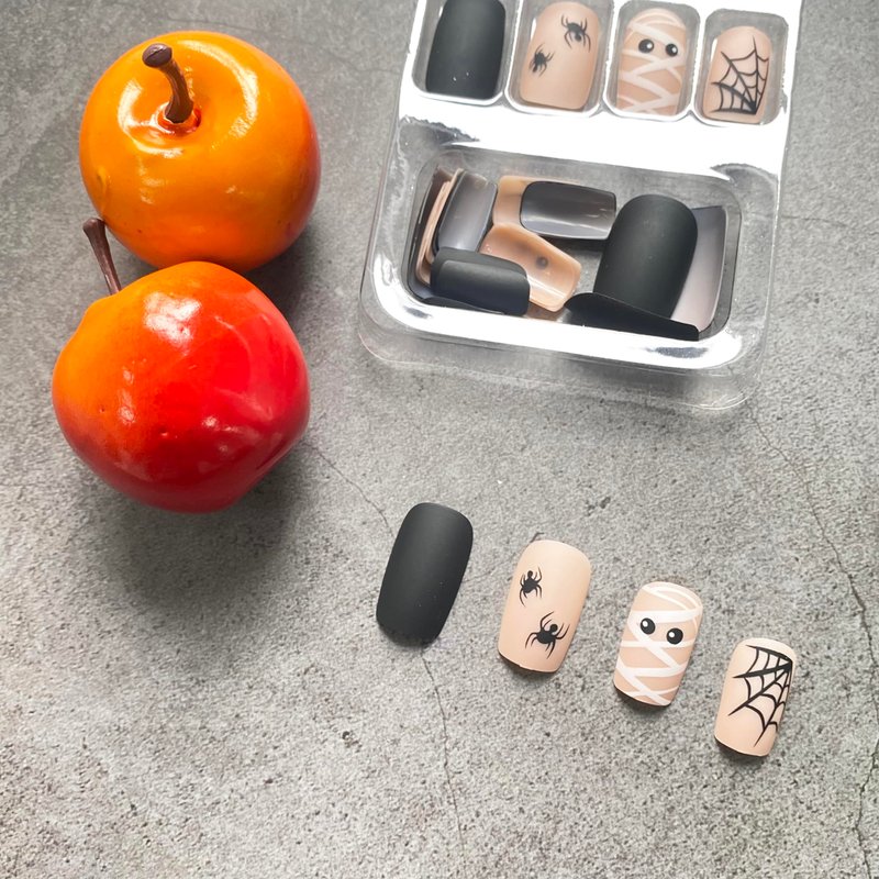 - Halloween Press on Nails➤ You will get 24 different size Halloween fake nails with jelly glue, make them last longer and will not peel off your nails for a long time, and it won't hurt your beautiful nails. Good for making a perfect nail art salon by yourselft at home.