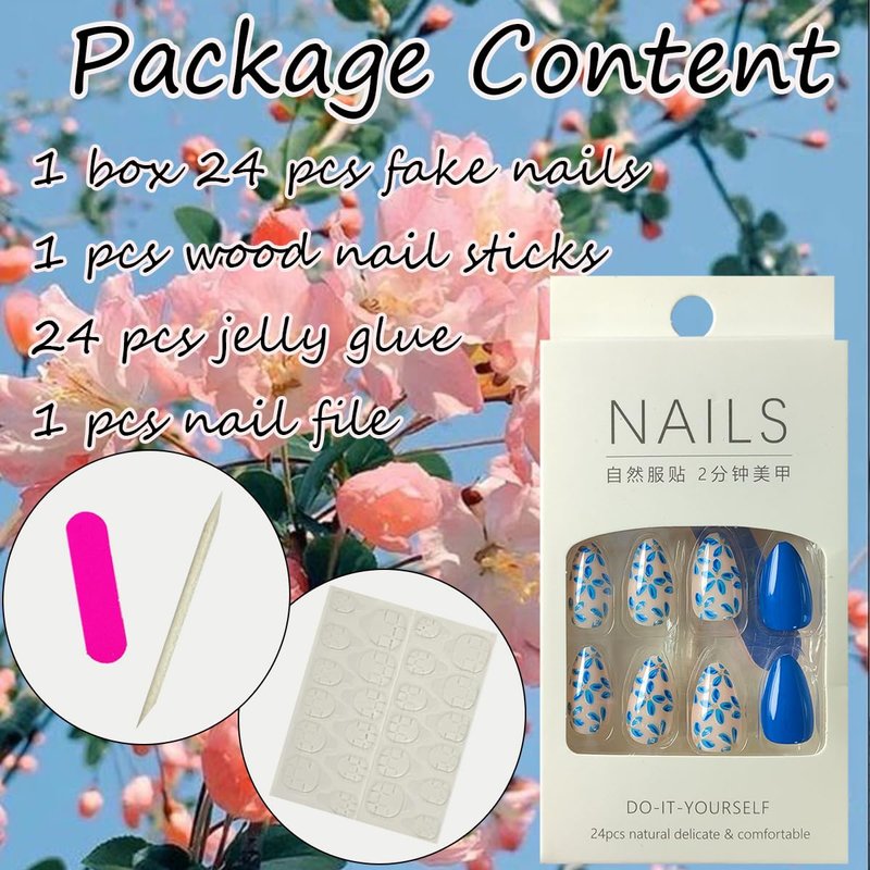 - Flower Almond Nails Kit : 24 PCS ,12 different sizes of flower short press on nails , 24 * jelly glue, 1 * nail file, 1 * wooden stick. Help you wear these flower fake nails better. A full range of tools meet all your wearing needs. It can be worn repeatedly so that you can replace it at any time, and it can better protect your nails.