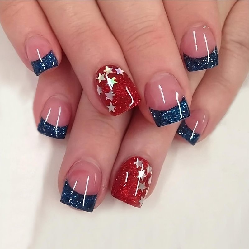 24Pcs Independence Day Star Press on Nails Short Square Blue French Tip Glitter Fake Nails for Women Manicure Decorations