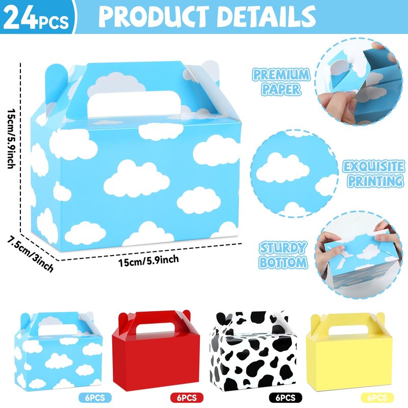 - Innovative Design and Vivid Colors: Our favor boxes are brightly colored with blue sky, white clouds, cow printing, and a combination of yellow and red. There are 4 designs in total, which combine to maximize the atmosphere of the cartoon story theme. It is especially suitable for toy birthday parties!