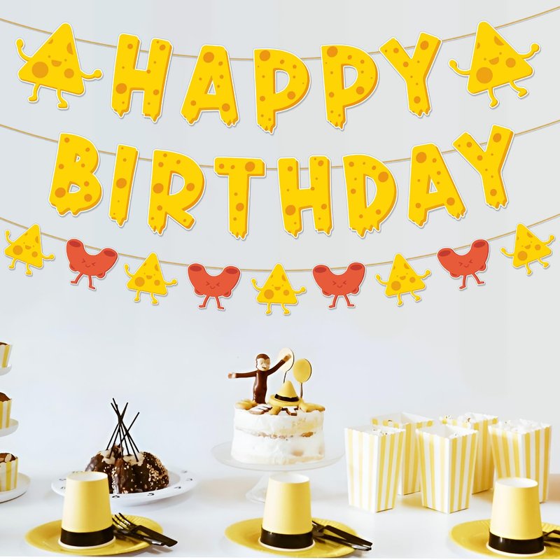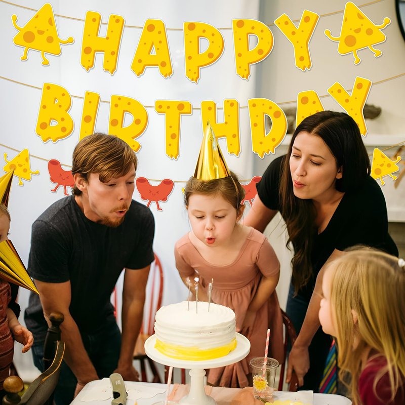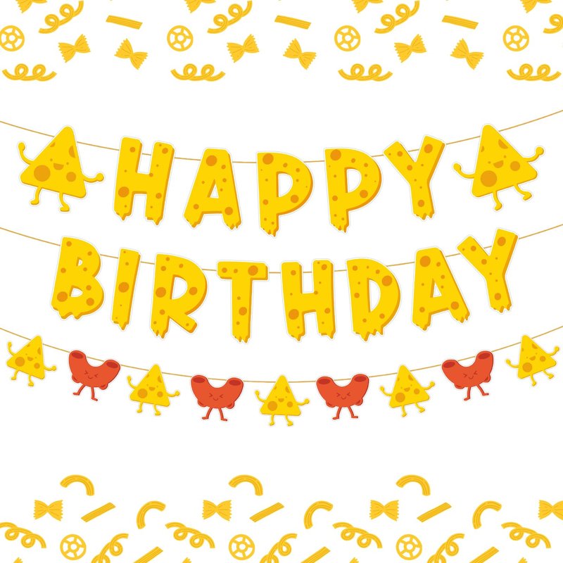 - Sweet Cheesy Happy Birthday Banner: This is a great set of cheese-themed birthday decorations that will make your party feel extra special. The set includes 1*Happe Birthday Banner (15pcs), 1*Macaroni and Cheese Garland (9pcs) and some assembly tools.