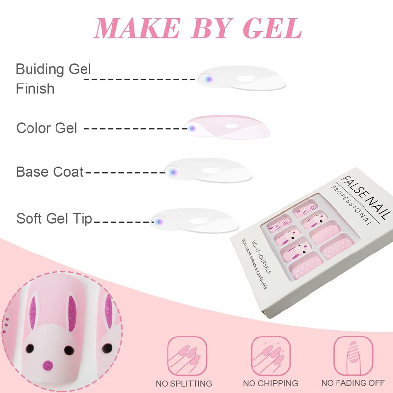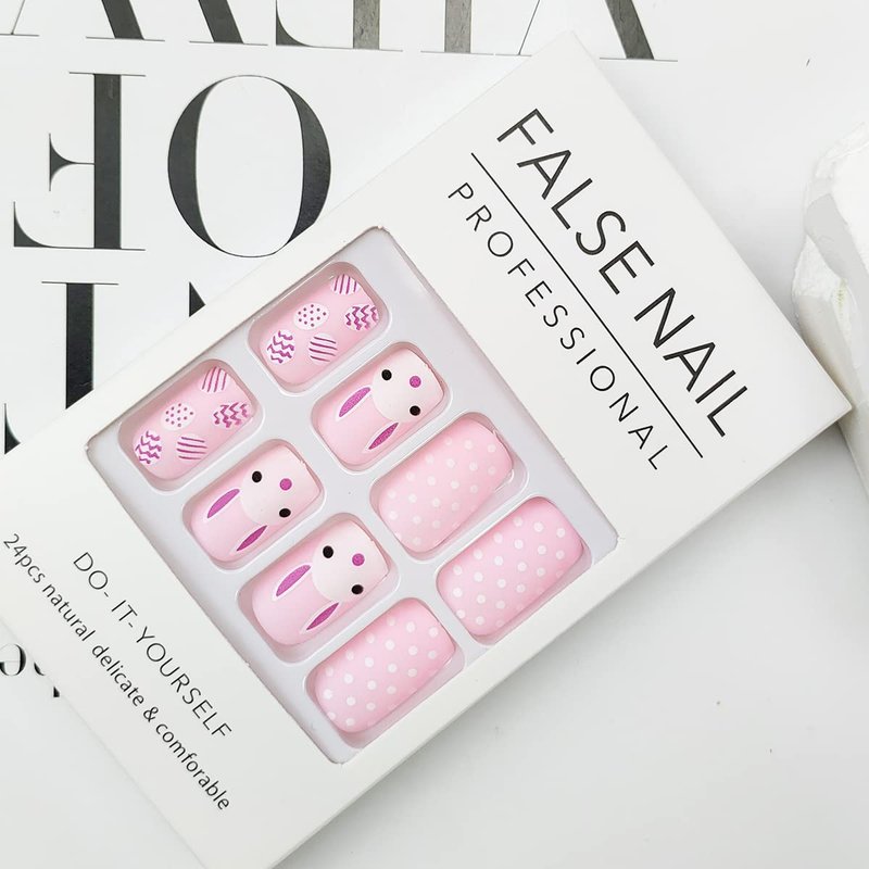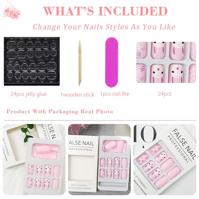 - What Will You Receive: The manicure kit includes 24Pcs Pink Easter fake nails, 1 jelly glue, 1 mini nail file, and 1 wooden stick. Meet your needs for the home salon.