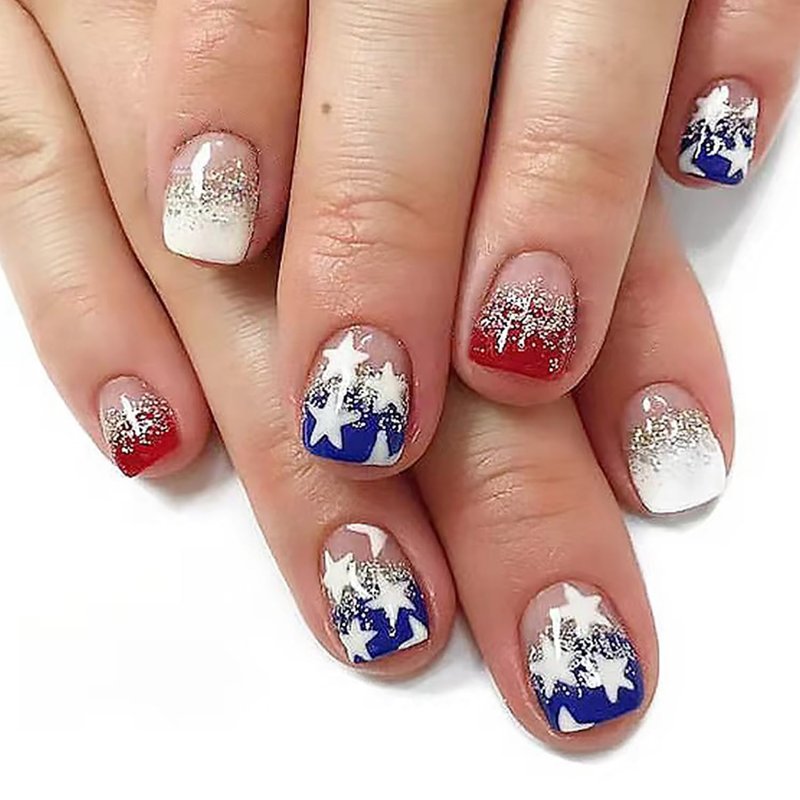 4th of July Press on Nails with Star Glitter Design Independence Day Fake Nails for Women Manicure Decorate Kit