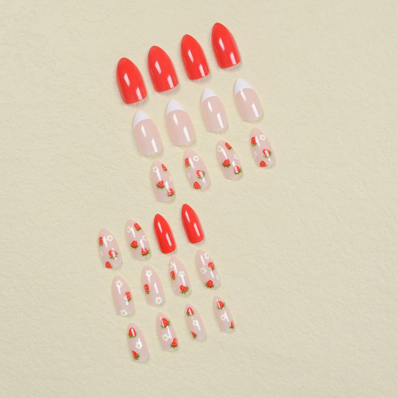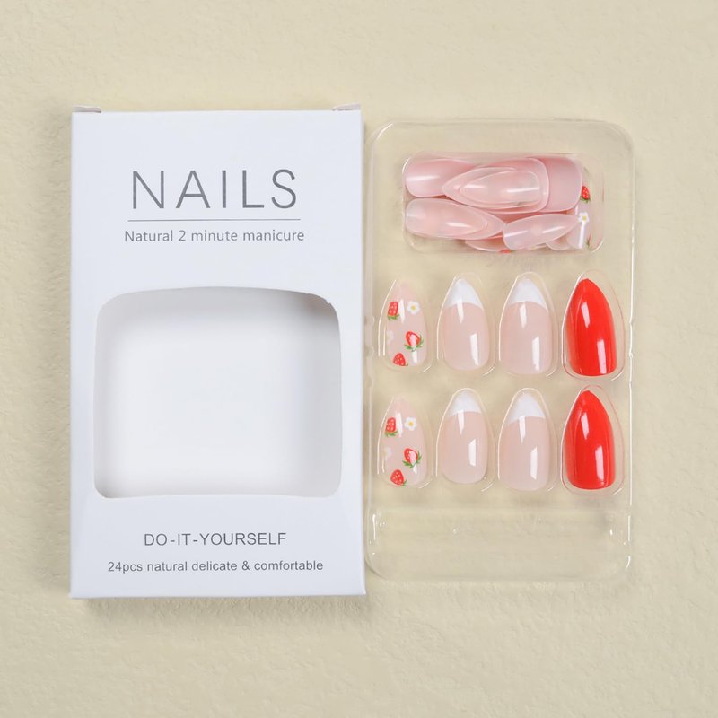 24Pcs French Tip Press on Nails Medium Almond Fake Nails Cute False Nails with Flower Strawberry Designs Full Nail Tips Natural Reusable Stick on Nails Full Cover Glue on Nails for Women Girls