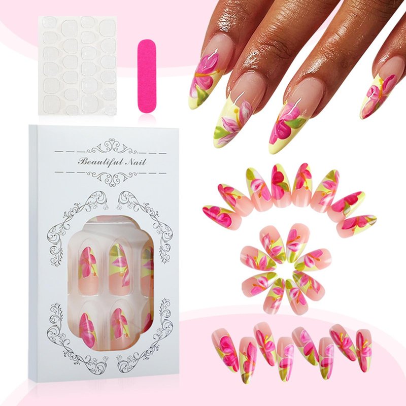 - 【Tropical Flower Fake Nails Package Contains】 24 Pcs cute false nails, 24 pieces of jelly glue, 1 mini nail file, 1 wooden stick. (Durability of jelly glue is not as good as liquid glue, but it makes fake nails reusable. Jelly glue can last about 3 days or more, glue remains longer.Please use your suitable glue according to different scenes)