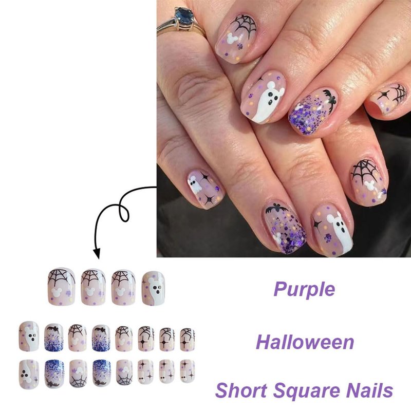 24Pcs Halloween Press on Nails Short Square Fake Nails with Spider Web Bat White Ghost Designs Halloween Acrylic Nails Full Cover False Nails Purple Glitter Cute Glue on Nails for DIY Halloween Nails