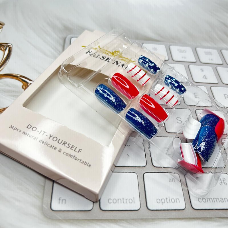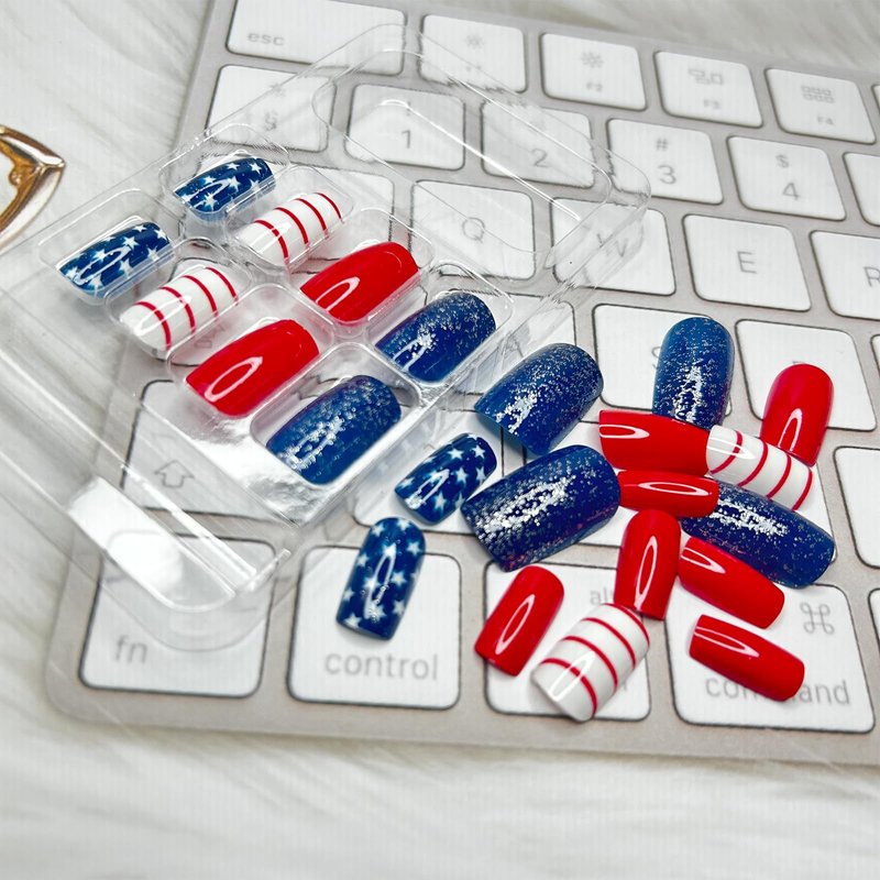 - Unique Fashion Design Nails:Independence Day press on nails offer you the most avant-garde colors, shapes, lengths. Combine the hottest trendy elements into false nails. Leading the new nail art trend.