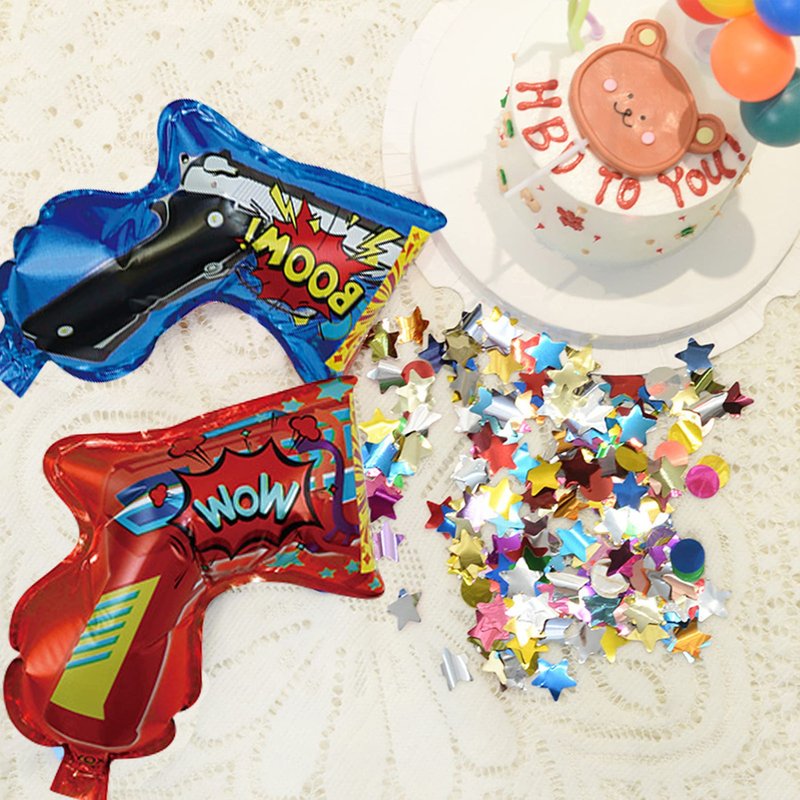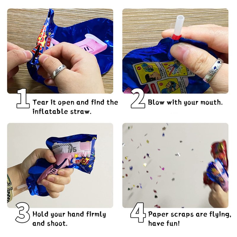 - Easy to use: The inflatable fireworks gun is a new type of self inflating party confetti cannon, which is inflated by blowing with the mouth, and is designed as a pistol. After the expansion,just squeeze the gun handle,colored confetti rain will erupt out, very funny.