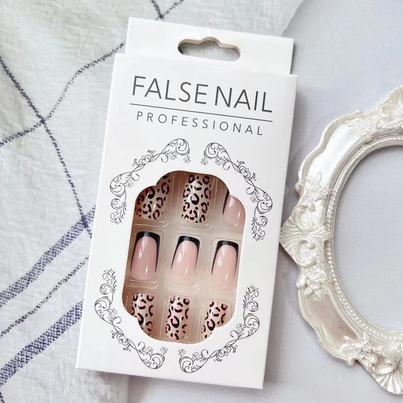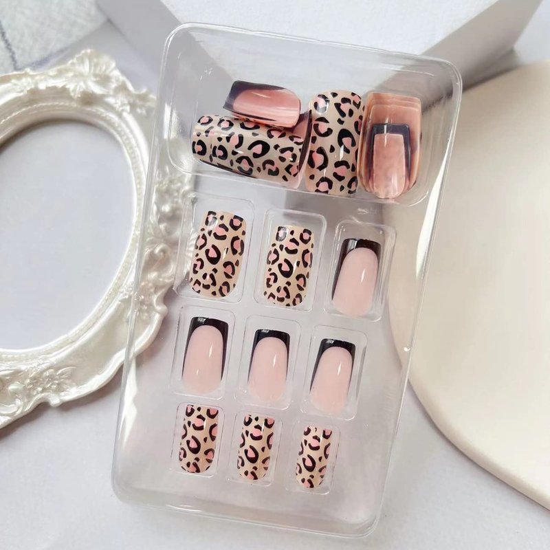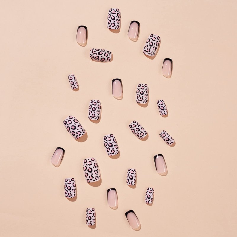 24Pcs Leopard Press on Nails Medium Fake Nails Square Shape Acrylic Nails French Tip Stick on Nails with Designs Glossy Glue on Nails for Women and Girls Nail Art Decorations