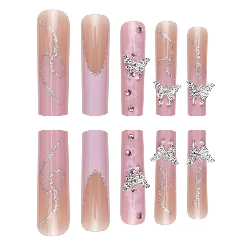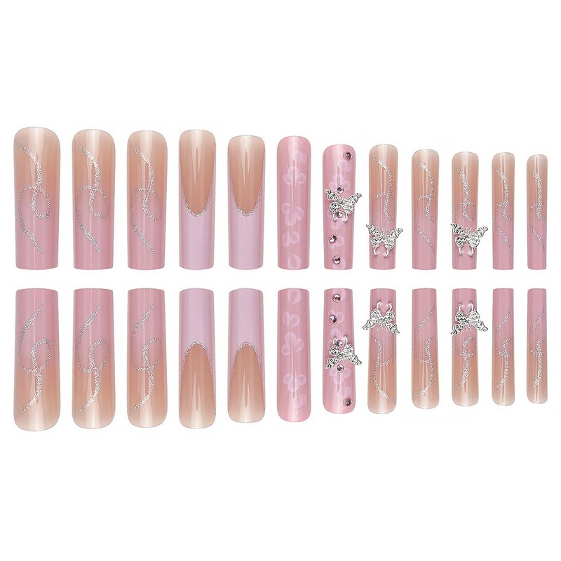24Pcs Long Square Press on Nails Pink French Tip Fake Nails Silver Rhinestones with Flower Full Cover Tips Glue on Nails Artificial Acrylic False Nails Butterfly Charms Design for Women Nails Designs