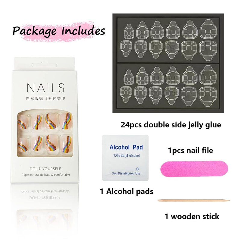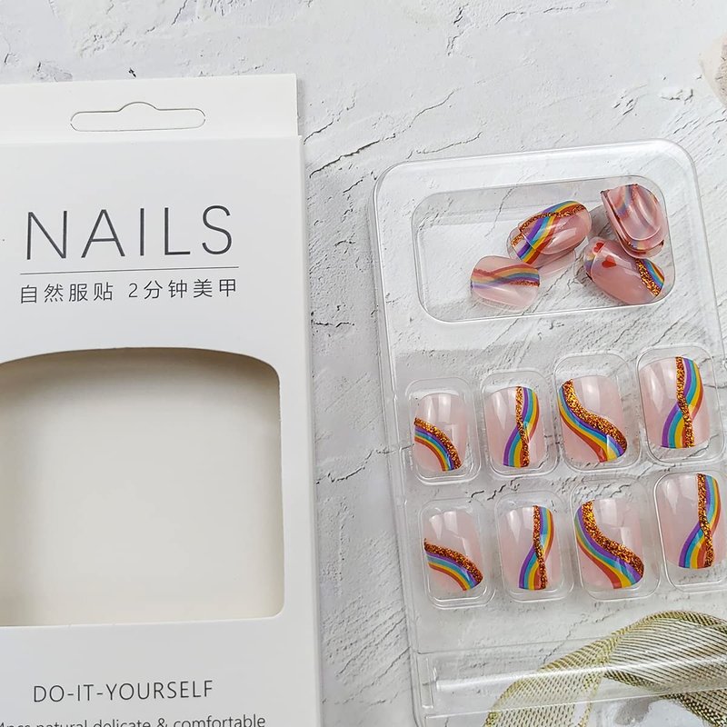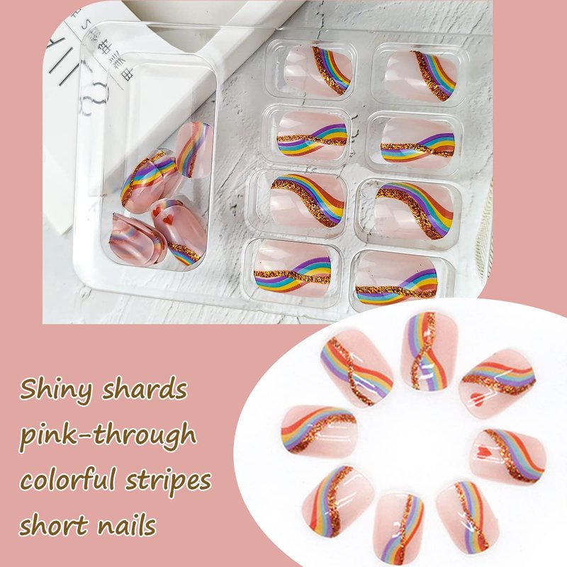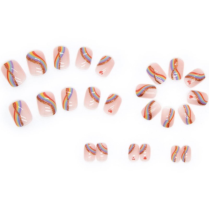 Product style:Short foundation gold glitter rainbow colorful striped heart press on nail set (24 pieces/box, with jelly glue)