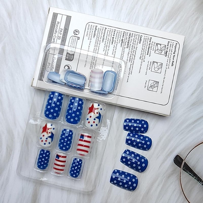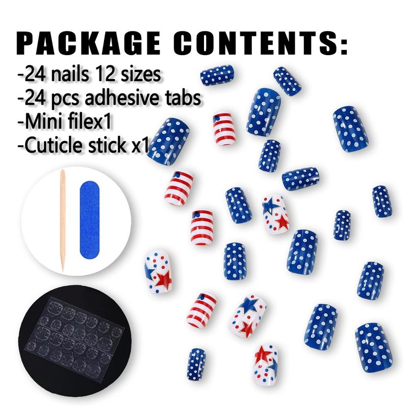- Package Contents: 24 Pcs Independence Day false nails and jelly glue stickers.(Jelly glue doesn't last as long as liquid glue, but it has the advantage of making the fake nail reusable. So I suggest please use suitable glue according to different scenarios)