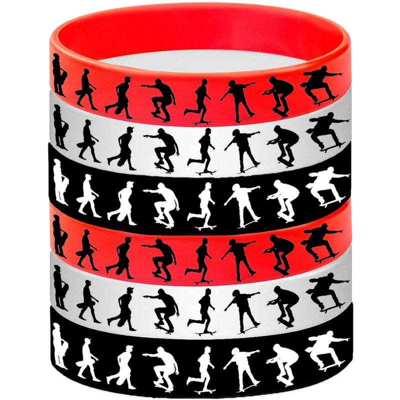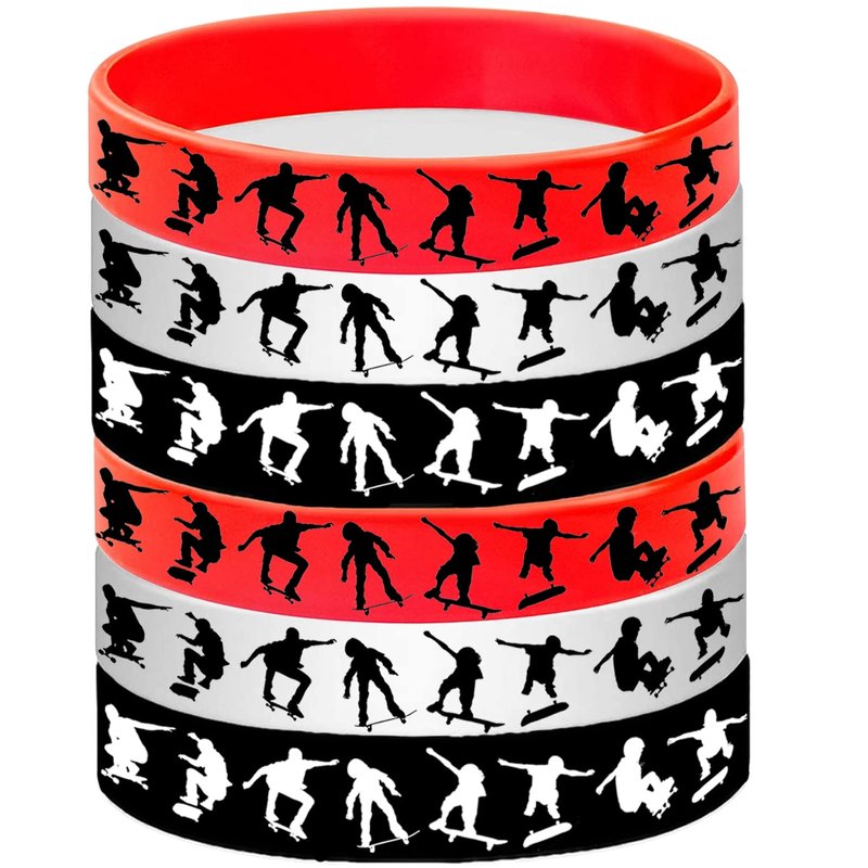 - Skateboard silicone bracelet set: 24pcs skateboard themed rubber Bbracelets, three color styles, black, white, red, 8pcs each, enough quantity to decorate a party.