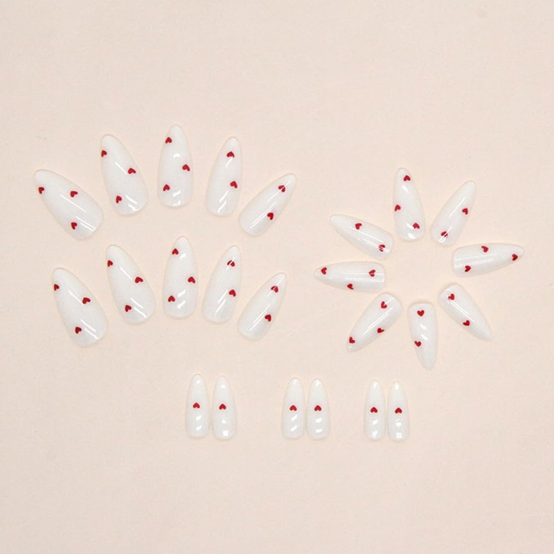 - šćWhat You Will ReceivećValentine's day press on nails contains 24 pieces of fake nails and 1 piece of tape (24 pieces in 12 different sizes), 1 nail file, 1 cuticle stick, 1 bottle of glue, 1 cleaning bag.