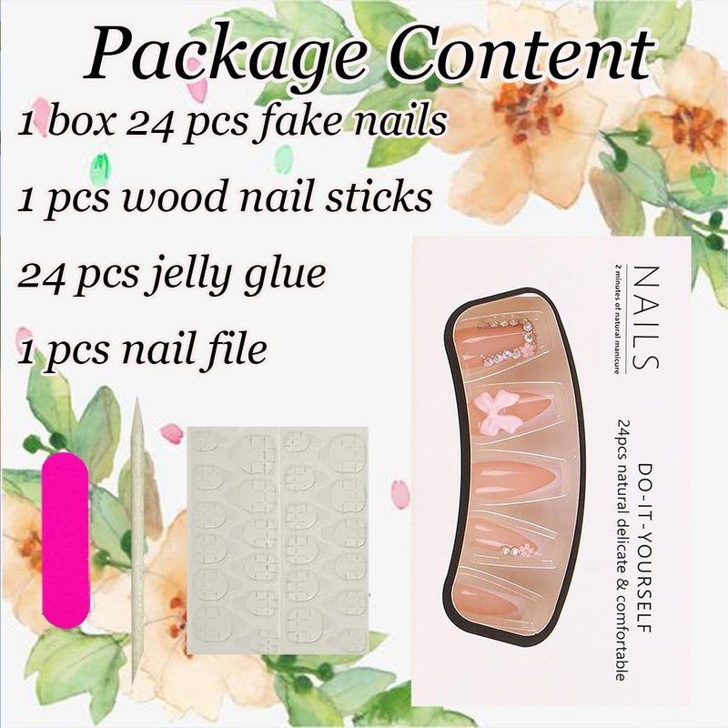 - 【French Tip Nails Set Package Contents】24Pcs Cute Bow Press on Nails +1 Nail File + 24Pcs Jelly Glue Stickers+1 Wooden Stick.(Durability of jelly glue is not as good as liquid glue, but it makes french tip fake nails reusable. Please use suitable glue according to different scenes)