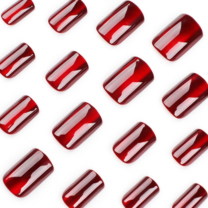 24Pcs Wine Red Press on Nails Cat Eye Fake Nails Medium Square Fake Nails with Glitter & Gradient Designs Glossy Acrylic Nails for Women and Girls Full Cover Stick on Nails for Women and Girls
