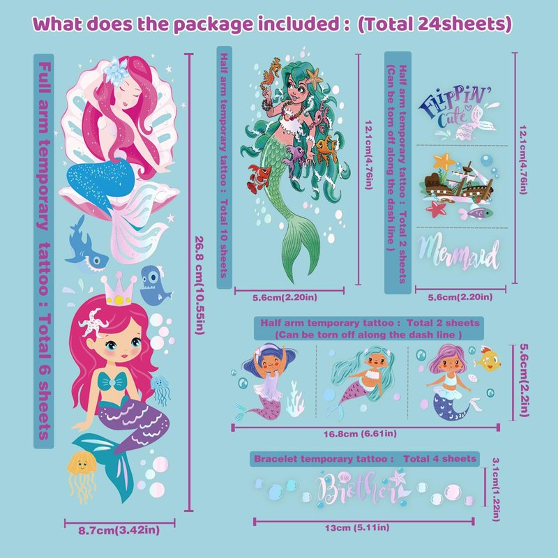 - ❥[PERFECT FOR DIFFERENT PARTY]: Mermaid bracelet Tat Perfect for any picnic, petting zoo party, Birthday, Friendship Party, day in the park, or at home activity! Total 24sheets. 6 sheets full arm + 12sheets half half + 4 sheets mermaid string bracelet+ 2sheet 16.8*5.6cm shoulder Tat