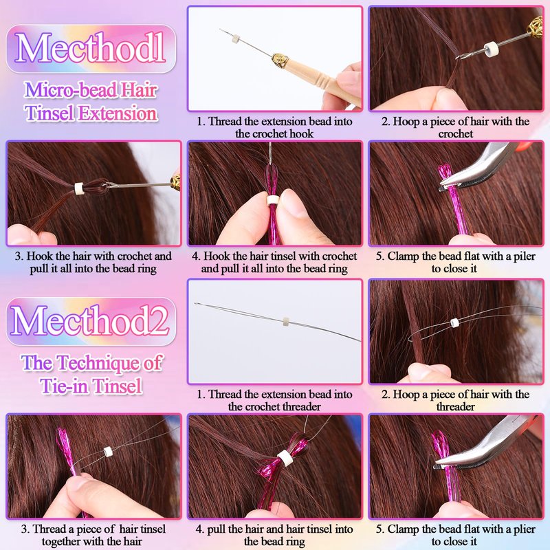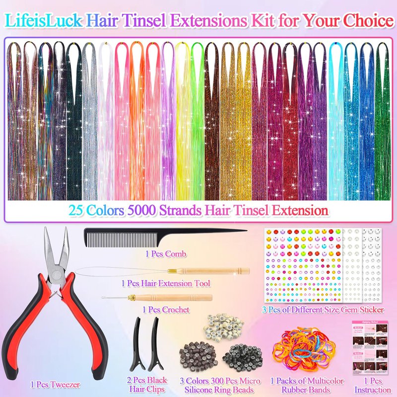- Fairy Hair Tinsel Kit: 25 Colors 5000 strands of hair tinsel, each color Has 200 Strands, 300 pieces of Micro Silicone Link Ring Beads in 3 colors (Black, Brown, Beige), 3 sheets of Gem Sticker, 2 pieces of Black Hair Clips, 2 pieces Ponytail Hoop Tools, 1 Pack of Colorful Rubber Bands(100pcs), Tweezer, Crochet, Hair Extension Tool, Comb. That is enough to create a pretty hairstyle and make you look more charming and eye-catching.