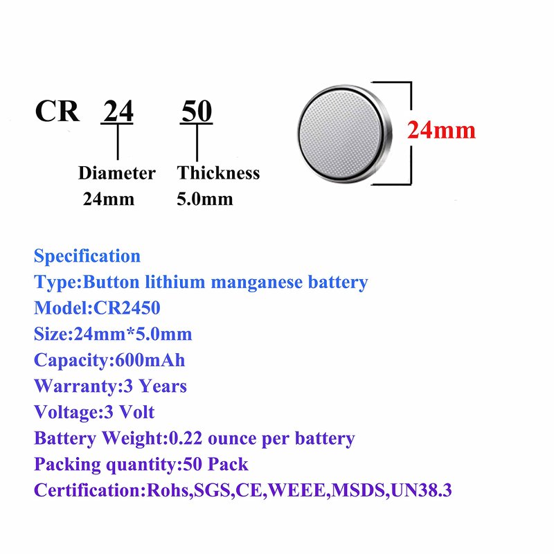 - Equivalent to DL2450,ECR2450,GPCR2450,CR 2450 Lithium battery because they all have the same dimensions 2450=24mm diamete 5.0mm thickness.