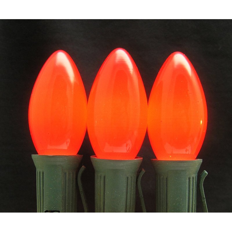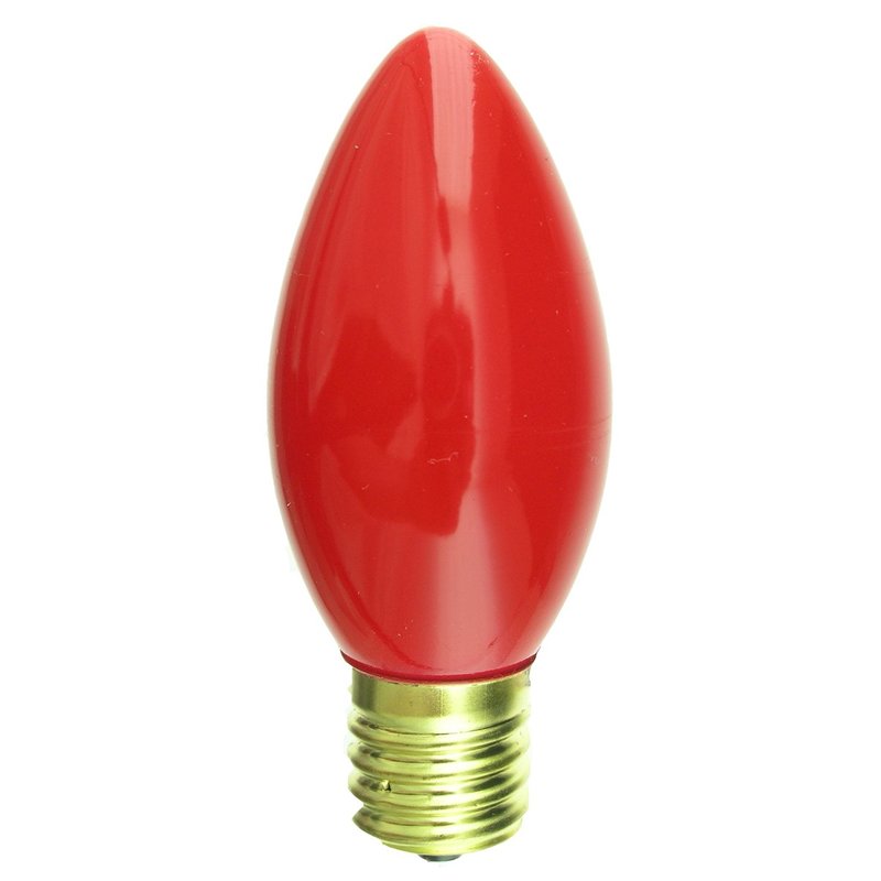 Our C9 shaped light bulbs are available in all standard colors and feature a ceramic red paint that is guaranteed to last the life of the bulb. These 7 watt, 130 volt bulbs have an hour life of 4000 hours. They are safe for both indoor and outdoor use allowing you decorate both the house and tree for Christmas! Each of these bulbs measures 1 1/4" wide, 3" tall and features a brass Intermediate (E17) base.