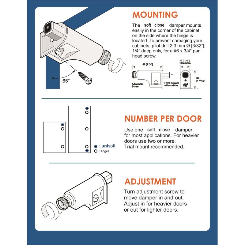 It's as easy as 1) Set it! - Set the adapter in the upper corner of the cabinet. 2) Screw it! - Screw adapter into place. 3) Adjust it! - Adjust the damper based on door weight.