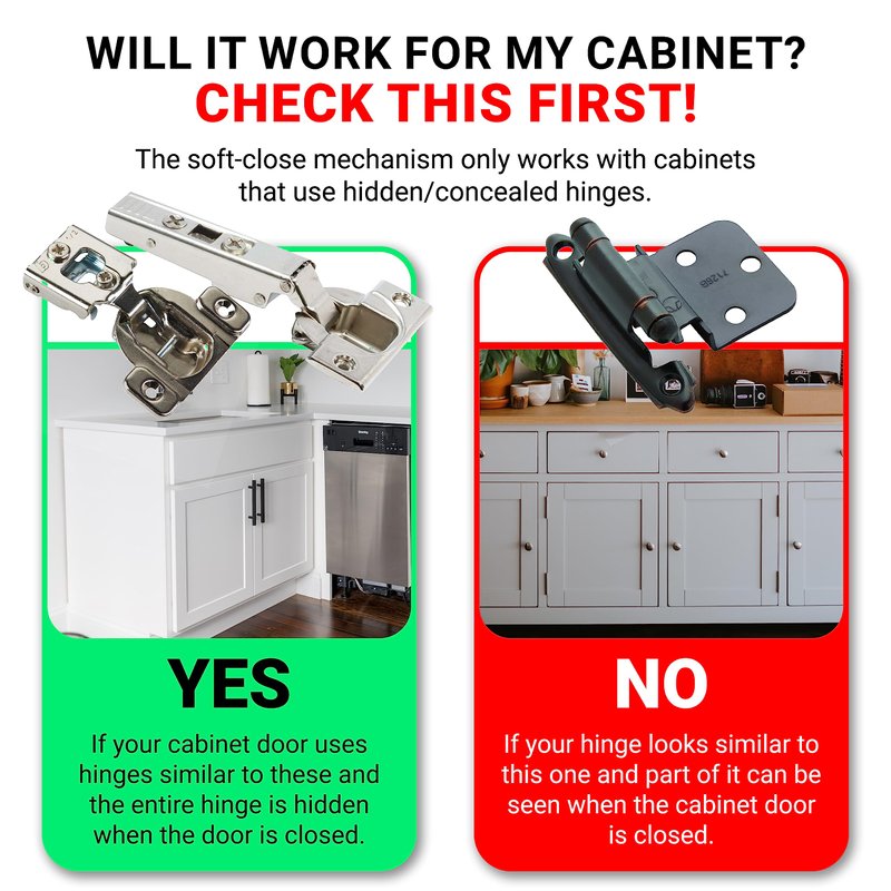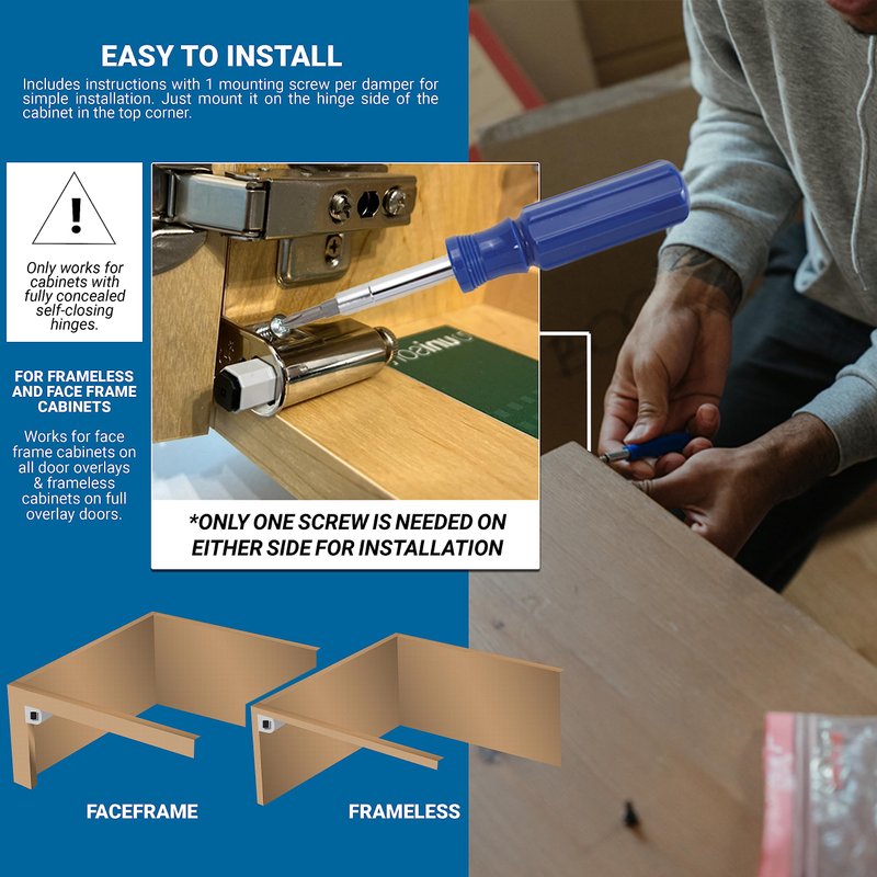 - INSTALLATION: Easy to mount in the corner of the cabinet. WORKS FOR CABINETS WITH FULLY CONCEALED SELF-CLOSING HINGES ONLY. Includes 1 mounting screw per damper for simple installation. Just mount it on the hinge side of the cabinet in the top or bottom corner.