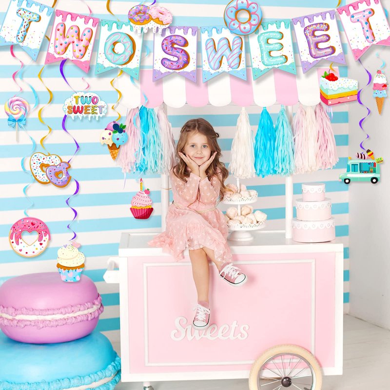 25 Pcs Two Sweet Donut Birthday Party Decorations Include Two Sweet Banner 24 Ice Cream and Donut Party Hanging Streamers 2nd Birthday Decorations for Girl Ice Cream Donut Decor