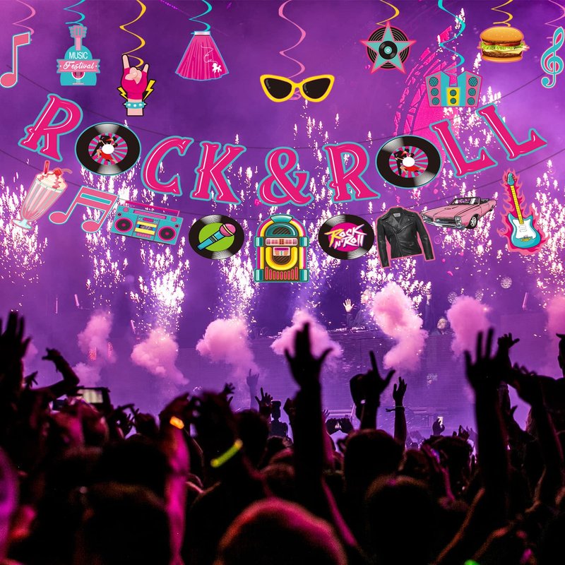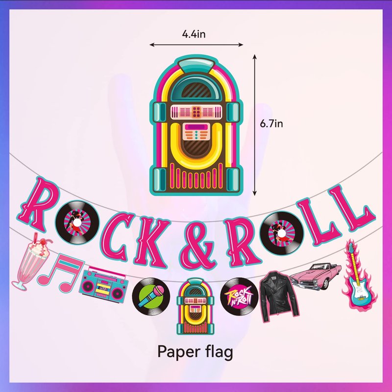 - 🍨Value Package Includes: 1pc Rock and Roll party banner, 1pc 50s theme garland banner, 18 pcs foil swirls, 5 pcs 1950's retro rock party honeycomb centerpieces. Enough quantity can meet your rock music-themed party decorations.
